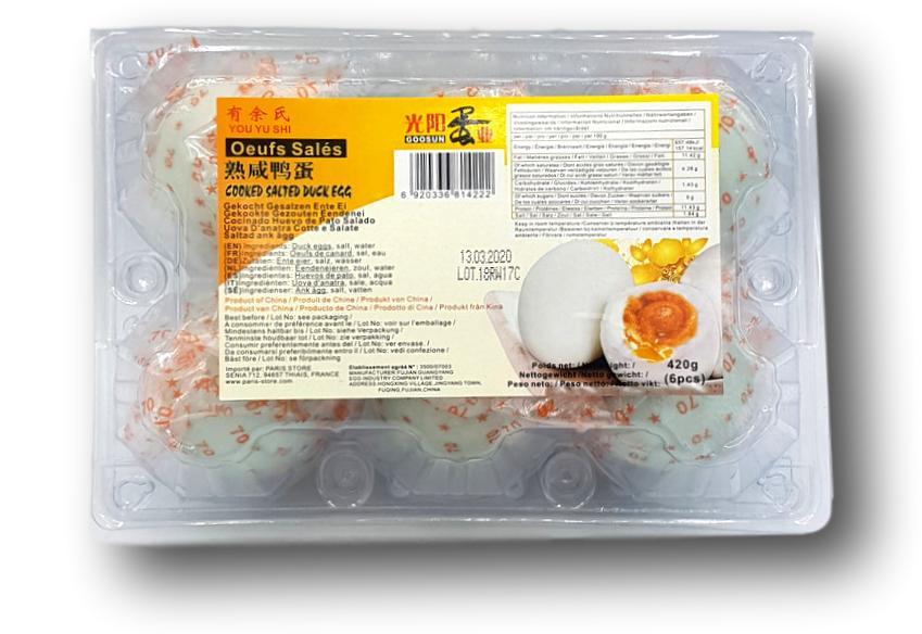 Products Fresh Goosun Cooked Salted Duck Egg 420 g Skip images Product Code: 6106-3 EAN: 6920336818916 Read more about the product In stock -0% 5,80 € Quantity Add to cart Description Ankan munat, suola, vesi,Kiina